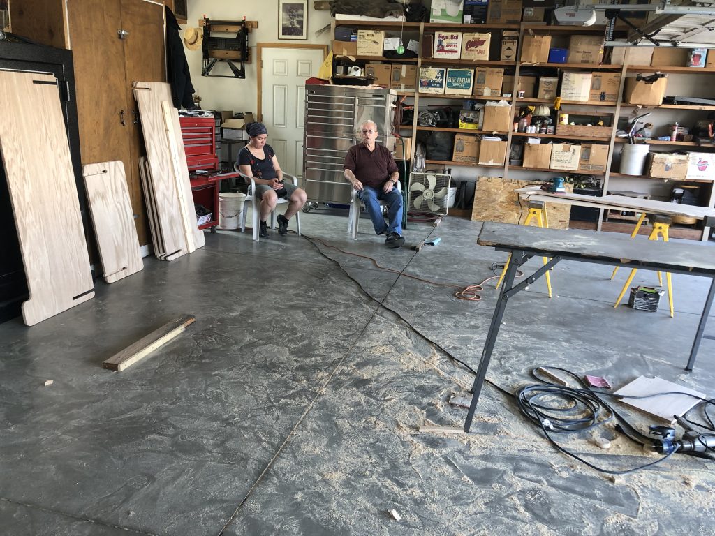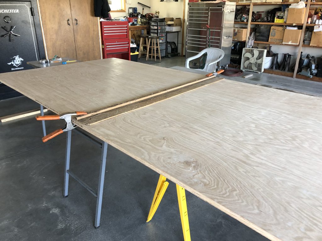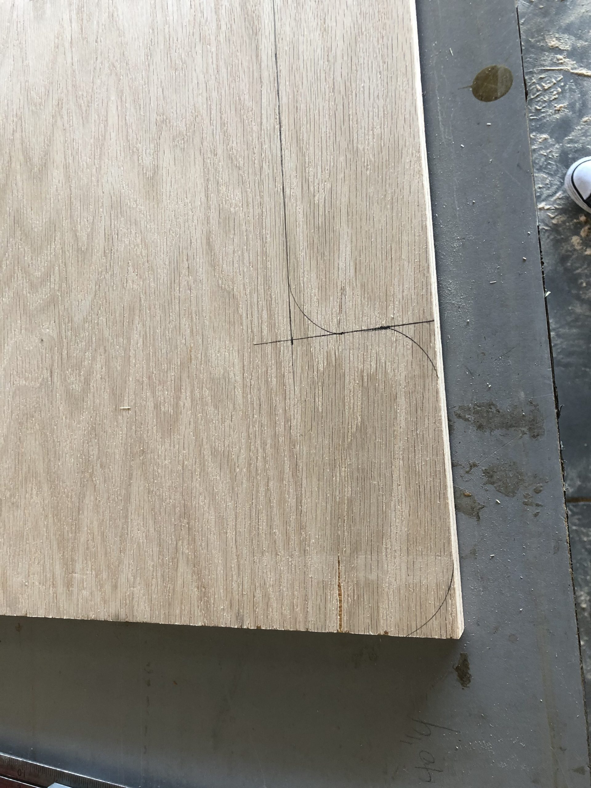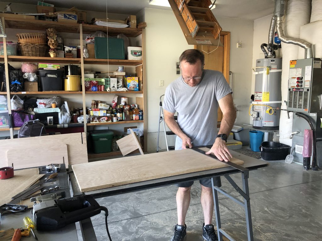 In Part 1, I am laying out the design on some heavy oak plywood, drawing the shapes of the legs and openings. We’re cutting the major pieces into the right sizes, and who is that? None other than my little helper Adam, making use of the pet door to come and help!