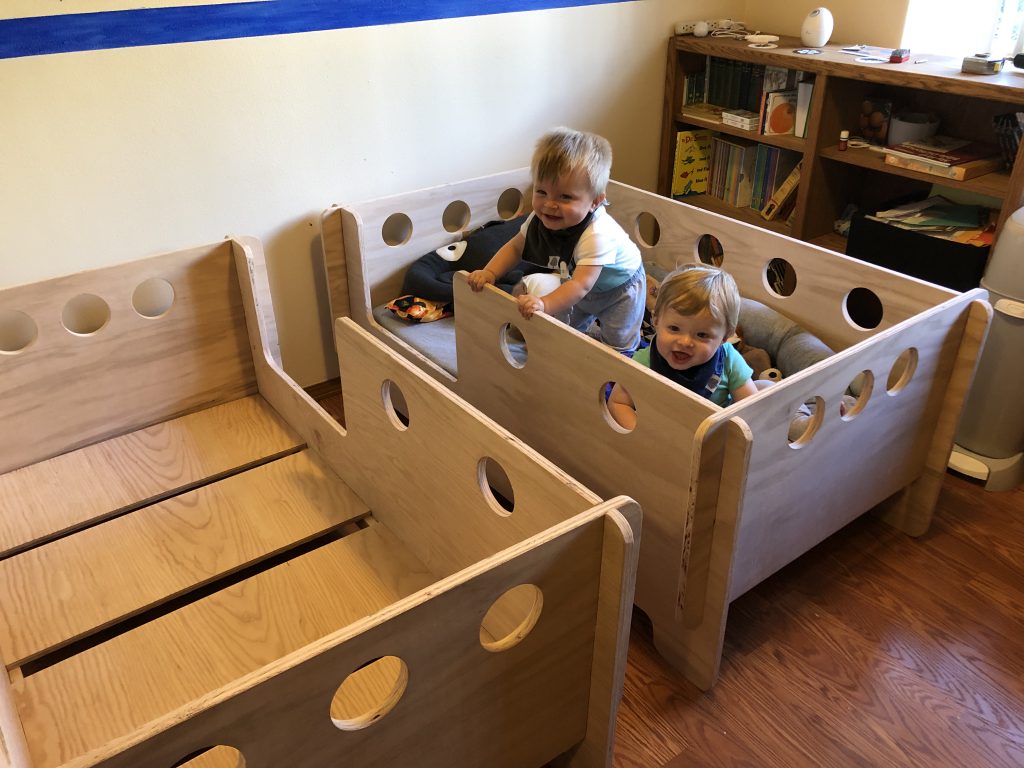We have transported the nearly completed beds across the mountains to our home and assembled them for the two little men. They are trying them out with their mural and artwork in the background.ains to our home and assembled the beds for the two little men. They are trying them out with their mural and artwork in the background.